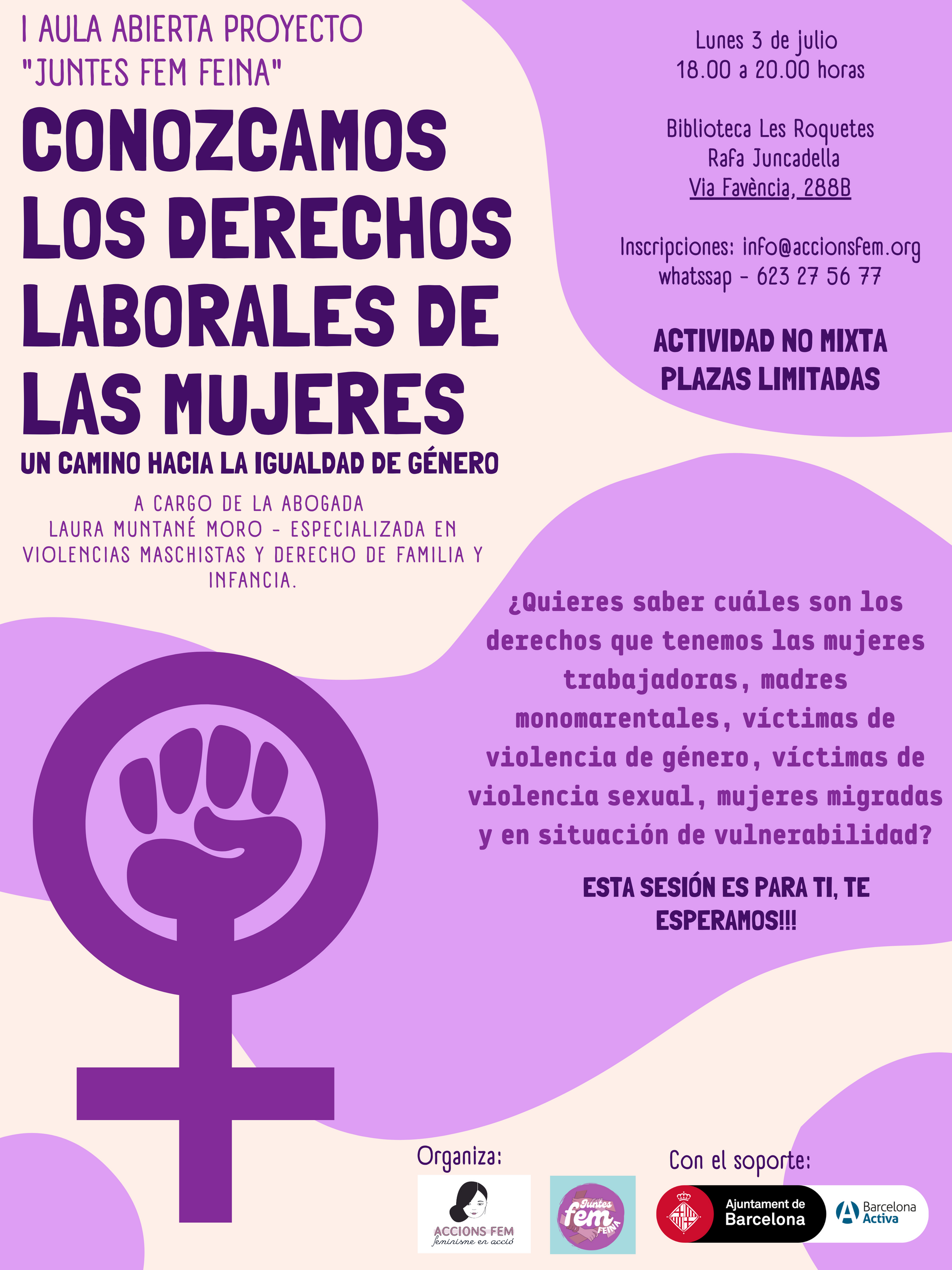 Des d'Accions Fem - feminisme en Acció convidem a totes les dones interessades a participar a la 1ª Aula Oberta del projecte “Juntes fem feina” d'acompanyament a la inserció sociolaboral, millora de l'ocupabilitat, l'autonomia i l'apoderament de les dones víctimes de violències masclistes i multivulnerabilitats amb el suport de Barcelona Activa, impulsem el que fas 2022.