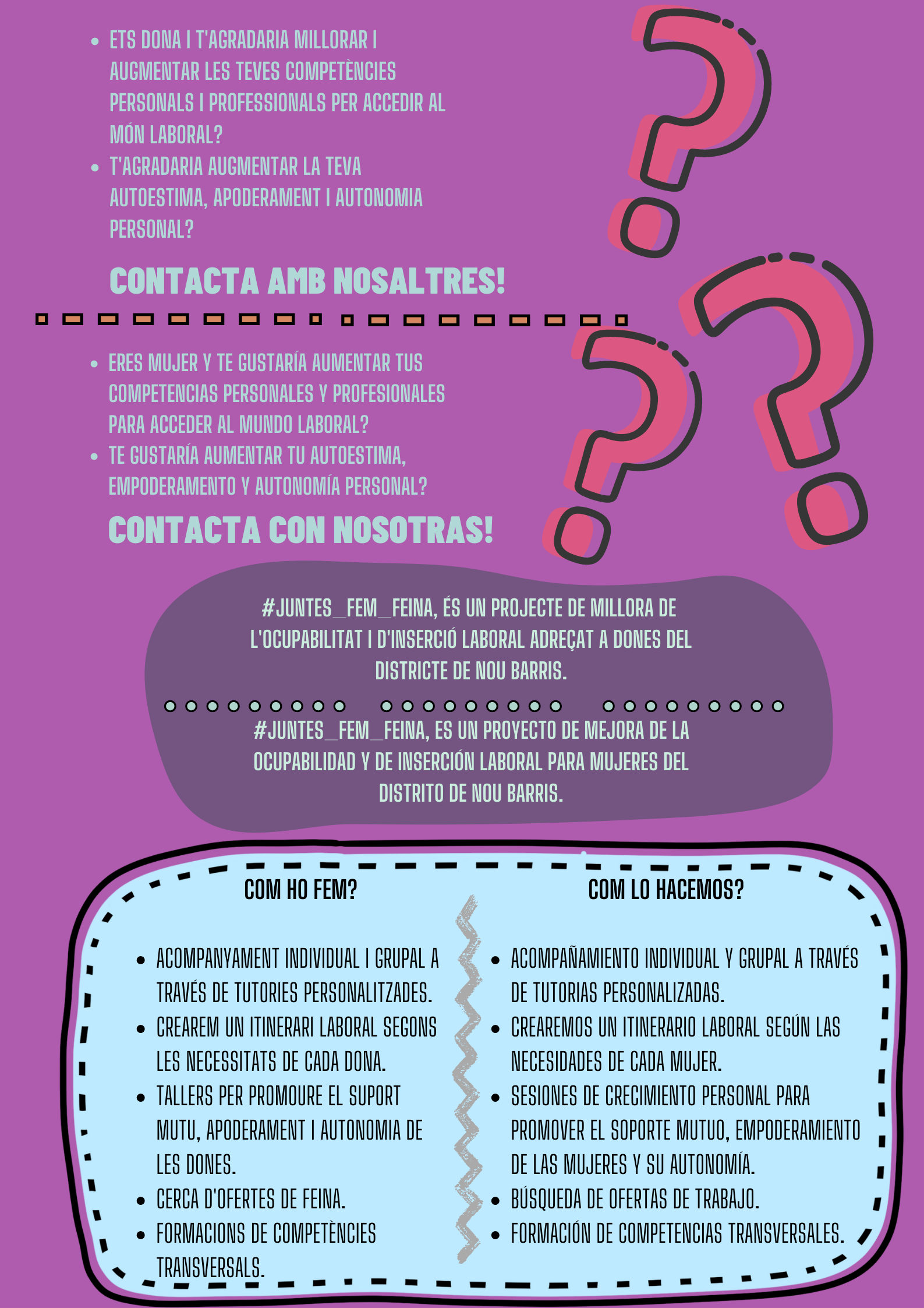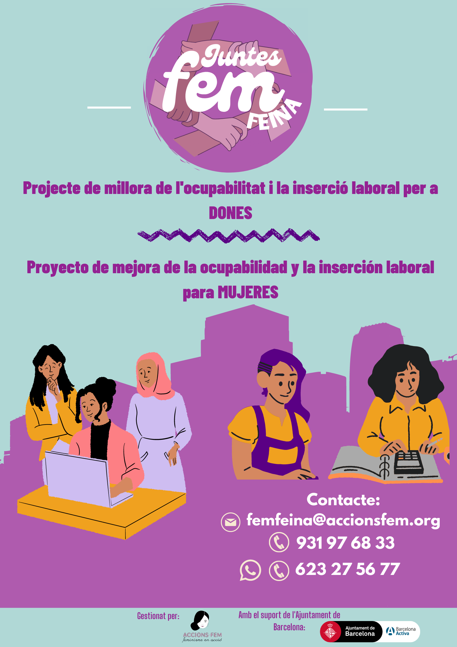 Des d'Accions Fem, hem posat en marxa, per segon any consecutiu, amb el suport de Barcelona Activa, el projecte Juntes Fem Feina, amb l'objectiu de millorar l'ocupabilitat i la inserció laboral com també l'apoderament i autonomia personal de les dones.